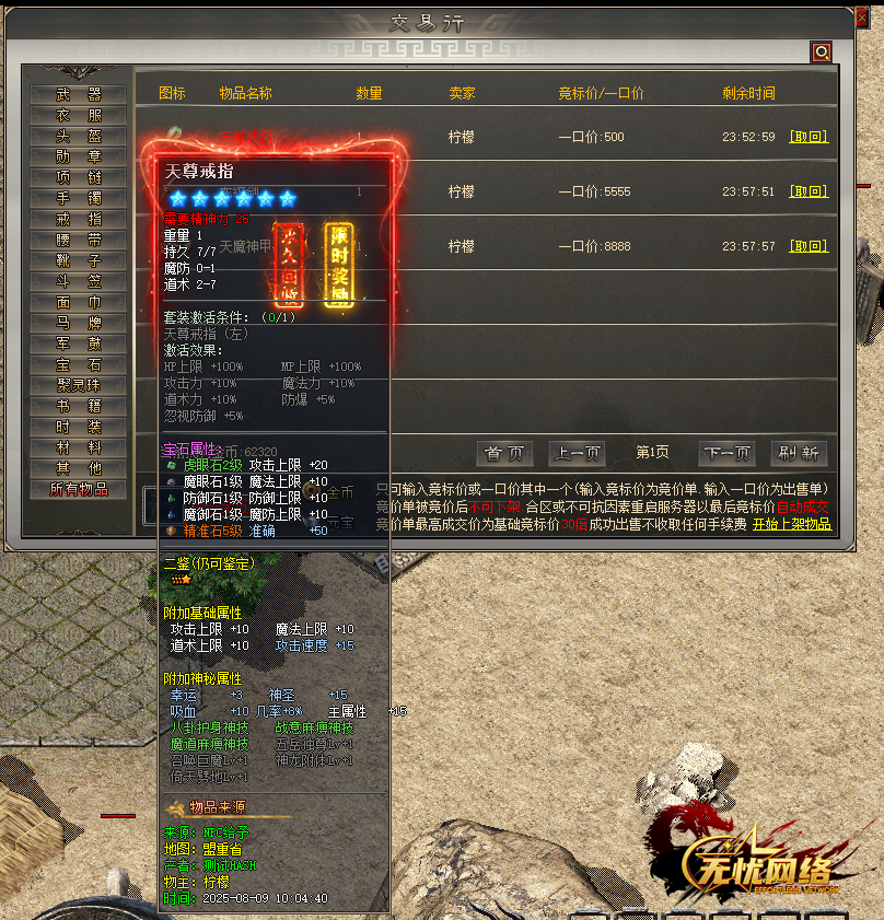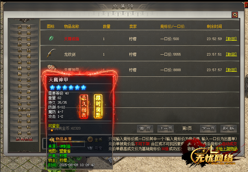 | 2025年8月09日。更新支持显示自定义备注信息。特殊属性等.双货币同时支持(临时关闭竞价模式,如需开启购买时请标注需求) 合区:单服务器多区无合区文本(合区无需操作).多服务器多区有合区文本(需要手动复制文本) 占用:占用一个个人标识。一个INTS 单服务器多区可以支持通区交易.多服务器多区只可支持单区。 可自由设置上架时间。拍卖单和一口价单时间可以单独设置。支持物品所有属性。极品 鉴定 宝石 特技 支持新老区不互通。比如 新区不可以购买老区的。但是老区可以购买新区的 联系QQ:1592180 |